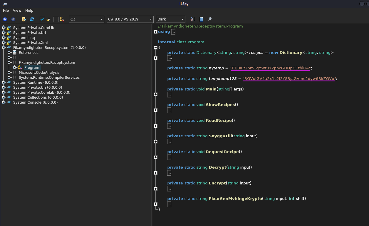 Vi får en .dll fil. Denna öppnar vi i decompilern ILSpy och hittar två strängar som ser ut att vara base64 kodade.